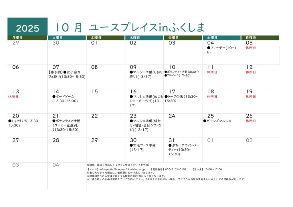 ユースプレイスinふくしまの10月のカレンダーをお知らせします。