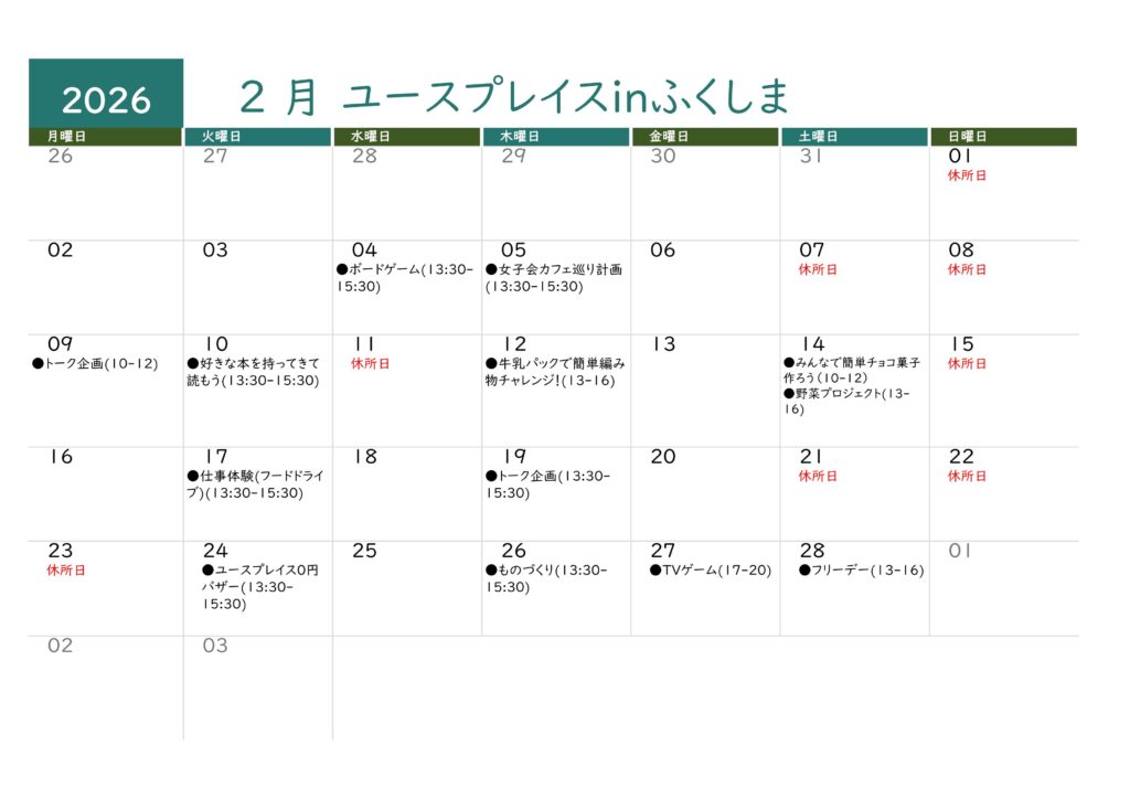 ユースプレイスinふくしまの2月のカレンダーをお知らせします。